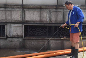 | 梅雨季節(jié),青苔是最容易滋生的植物。投資廣場污水排水管道因市政軌道施工而被堵住,只能依靠排水泵自主排水到路面 |