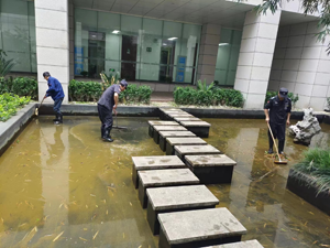 | 近期低溫中心景觀池邊上綠植翻新,新綠植養護造成爛泥淤積在景觀池底部,甚是影響美觀。項目部決定對魚池淤泥進行清洗, |