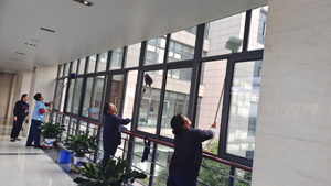 為了使整個院內(nèi)的環(huán)境看起來干凈清爽,第二天下午保潔班長安排全體保潔人員把A座1樓至5樓的所有窗戶里外兩面徹底擦拭。大家分工明確,合作行動,分別拿來各種工具到自己分配的包干區(qū)域,他們先把玻璃打濕,接著是擦拭窗框和縫隙里面的灰塵,然后拿來玻璃刮對玻璃進(jìn)行深度清潔。外墻的窗戶夠不到的地方,保潔阿姨們就用半個身體探出去擦,而另外一名阿姨就扶著她的腰,避免出現(xiàn)意外。
