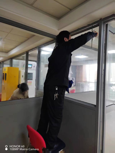 12個實驗室全是用玻璃隔斷的,地面是塑料地毯,所以我們最大的任務就是擦拭玻璃和清潔地毯。保安保潔分工合作,一組擦玻璃一組清洗地毯,保潔用清潔劑擦拭玻璃后,保安再用玻璃刮刀刮玻璃,這樣一套流程下來,玻璃锃光瓦亮。地毯污垢保潔阿姨們再用工具擦拭,再用拖把拖干凈,一個小時后一個實驗室清理完畢。整潔的環境,給人帶來的視覺舒適感真的很棒,接下來還有11個實驗室等待我們去挑戰.......
