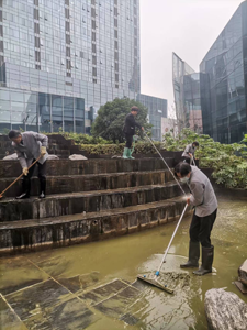 為給業(yè)主創(chuàng)造一個良好、優(yōu)美的工作環(huán)境,傳媒中心保潔員們對景觀池進行了一次徹底的清理,早上,傳媒中心還少見人影,保潔員們已經(jīng)換好工裝,準備開始對景觀池進行清理工作,他們帶上手套,穿上雨靴,先對池底淤泥進行清理。他們一個人拿著高壓水槍對池底淤泥沖刷起來,這邊再把泥水拖進排水溝,泥水雖然沾濕了褲腳,但他們毫無在意。他們對每一個臺階都進行沖刷、清洗,不放過每一個角落,為的就是給我們業(yè)主以及員工一個美好的感受。經(jīng)過了半天的清理工作,景觀池煥然一新。