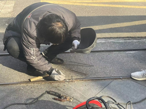 由于近日天氣仍然寒冷,人在外面站一會都感覺受不了,更別說是在外面干活了。只見戴師傅身穿一件薄棉衣,蹲下左看看右看看,在最合適的位置拿錘子一點一點砸著,不一會就把一段壞的地軌拿了出來。又戴上電焊面罩,只見一陣焊光閃現,焊條在戴師傅的手里就像聽話的玩具,一會左一會右的,隨時調整著位置,他時不時還要看看地軌焊得美不美觀。時間也不知過了多久,戴師傅一臉滿意的笑著說:“現在可以了”。