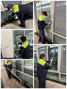 清洗玻璃是我們保潔員的一項重要任務。周三保潔主管組織所有保潔把奧體中心的玻璃窗戶進行清洗。她們兩兩一組,首先將濕潤的涂水毛頭裝在伸縮桿頂部,沿頂部平行濕潤玻璃,然后以垂直上落法濕潤其他部分的玻璃,再在伸縮桿上換上玻璃刮刀,用玻璃鏟刀鏟除玻璃上的污漬,再用玻璃清潔劑與水稀釋后對玻璃進行清洗,涂擦。再刮除玻璃上的水份,并同時用干凈的抹布擦干凈窗框和窗臺,用干燥的無毛的棉布擦干凈玻璃四周和中間的水珠,最后用拖把將地面清拖干凈。