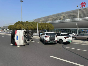 近日,高鐵北站閘道通往南一路路口,一輛白色新能源車突然撞至臨時停在南一路邊接客的機動車,導致路邊兩車撞在一起,而新能源車由于撞擊也翻了車。此時南一路值勤保安李明立即通過內部對講機向項目經理劉源、班長姚洪雷匯報情況。