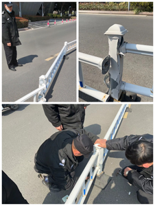 發現問題后,我司安保員立即將情況上報主管,并打電話叫來其他同事幫忙,一起將發生位移的護欄掰回原處。在移動中又發現其中一處固定護欄的支架已嚴重變形,用于固定護欄和支架的螺絲和底座都已完全脫落。保安員們又立即找來鉗子和螺絲刀等工具,將受損變形的支架敲平,再將脫落的護欄裝進底座用螺絲固定好,使這段因碰撞發生損壞的護欄及時得到了修復,再次恢復其分流車輛,疏導交通的作用。