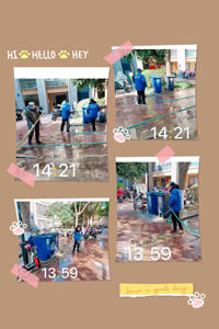 此次沖洗工作主要針對小區主干道地面,保潔員們穿上工作服,各有分工,相互配合。保潔人員先放水打濕地面,然后用用掃帚對有清洗劑的地面進行仔細的清掃。沖刷過程中采用地毯式清洗,對地面表層及縫隙里的泥沙、青苔、頑固污漬進行仔細洗刷,不放過任何一個細節,被清理后的地面看起來非常干凈舒適,得到了小區住戶的一致好評。