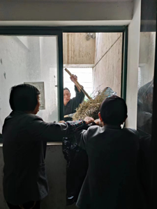 9點20分,保潔隊長向師傅從樓道窗戶翻越到平臺上,接過保潔手上的簸箕和掃把在平臺上開始忙活起來。只見他先將腳邊區域的垃圾掃到一邊,再從平臺邊緣開始一掃帚一掃帚地進行清理,直至將所有垃圾都清掃完畢。2名保潔則在樓道內打開垃圾袋子,由向師傅將歸攏好的垃圾一點點傳遞出來放入垃圾袋中,最后保潔掃尾打掃好樓道衛生,此次平臺清理工作圓滿完成。