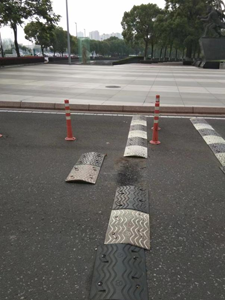 因為車流量大,減速帶每天都在承受著各種過往車輛不同程度的碾壓、沖擊和磨損。我項目安保員在本周的日常巡檢過程中,發(fā)現(xiàn)一號崗?fù)こ隹谕ǖ赖牟糠譁p速帶因固定螺絲脫落發(fā)生了位移情況。移位的減速墊塊已經(jīng)跟整體減速帶不在一個平面上,不僅不美觀而且起不到強制減速功能,更嚴重的是減速墊移動后,用于固定減速墊的鋼釘全部裸露凸出在水泥地面上,很容易扎破汽車輪胎和絆倒行人造成傷害。