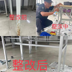 面對如此龐大的工程量,保安員們沒有退縮,他們決定利用空余時間進行修復工作。他們先用噴漆將桌腿全部噴一遍,晾干約10分鐘后,再用沙皮紙細細打磨起來 ,在5名保安4天的努力下,終于完成了這項工作。驗收時,客戶看到我們保安員將生銹的板凳桌子打磨得干干凈凈,臉上也露出了滿意的笑容。