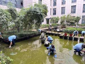 接著保潔、保安齊上陣開始行動。由于池底青苔粘滑,難以清洗,大家劃分區(qū)域,拿著鋼絲球一點點擦拭,然后再拿推水把清理污垢。經過大家齊心協(xié)力的勞作,原本渾濁的魚池變得清澈見底,還給了小魚兒一個干凈的家。大家看著自己拯救出的小魚兒在池子里盡情戲耍,都露出了欣慰的笑容。