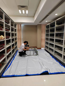 水務(wù)大廈檔案室大概有兩百平米,室內(nèi)墻皮脫落,地毯破舊、屋頂發(fā)霉發(fā)黑,檔案柜積灰深厚,需在一周內(nèi)全部整改到位。于是項(xiàng)目部整個(gè)團(tuán)隊(duì)立即分工合作行動(dòng)起來。