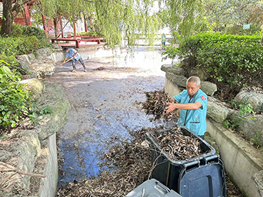 德安醫院的項目院內,有一個小花園,園中經常有工作人員和病人在此納涼休息。景觀池因為水池管道的問題,已經有一段時間沒有放水了。經過一個夏季,池中落葉和淤泥堆積,影響美觀的同時也存在潛在的健康風險,項目部安排近期在池內較為干燥時清理水池。盡管現在的天氣并不像大暑時那般炎熱,但溫度仍然較高,且池邊假山的景觀石有的已松動,如果在池邊上清理落葉的話存在安全隱患。項目主管為了減少員工高溫的工作時間及避免員工發生意外,在上午先行到池內清理池邊上沿的落葉。午后安排保潔帶上鐵鍬大垃圾桶等物到池內清理,幾個人分工合作很快就把大水池清理干凈。