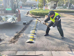 由于停車場是高鐵場站的重要組成部分,車輛在進出停車場時需要經過減速帶,而維護不善的減速帶存在著嚴重的安全隱患。為了解決停車場減速帶老化和維護不善的問題,對高鐵場站停車場的減速帶進行定期檢查和維護是至關重要的。近日,地面停車場秩序維護員在區域巡邏時發現有一處減速帶嚴重損壞,中間露出兩排鋼釘,不僅失去了減速的作用,還容易將過往車輛的車胎扎破。他立即將這一問題上報領導,項目經理劉源迅速對現場情況進行查看,并與相關部門對接聯系,隨后秩序維護員劉本良協助維修班工作員對地面停車場靠4號崗亭交叉路口的破損減速帶進行了更換,給過往的車輛和行人提供了便利,確保通行安全。