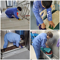 初冬清晨霜寒露重,項目部員工自發提前到崗,天沒亮就開始忙碌,因為拖地面消毒、收集垃圾必須在醫護人員上班查房之前完成。(以勉人多行走地面不干造成不良后果,打吊瓶時收垃圾會給病患形成交叉感染)。我們員工都必須了解早上先做三大件:拖地、收垃圾、刷衛生間,然后做周期細節衛生。在此工作期間,保潔阿姨們始終認真仔細地完成每一項工作。