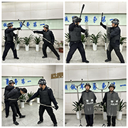 演練開始后,模擬工作期間有歹徒企圖強行進入大樓,威脅員工安全,安保人員立刻阻攔,門衛用對講機呼叫報告組長。組長及各組員迅速到達現場(3分鐘之內),各組員手持器械。組長緊急下達命令,立即啟動《反恐反暴應急預案》。組長及時將附近員工疏散到安全地帶并撥打報警電話(110、120)。各組員第一時間使用鋼叉、盾牌、橡膠棒等將歹徒圍住。組長與歹徒交涉,周旋,聯手成功制服企圖入侵的歹徒,防止大樓員工受到傷害,隨后幾人把歹徒移交警察處置。