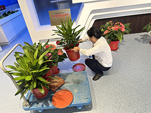 綠化人員送來了新鮮的盆栽,保潔班長分工合作,全體保潔把自己崗位綠植品種領走更換。她們先把快要枯萎的綠植從盆栽里拿出來然后換上新的綠植,新的綠植全部到位,再拿來裁紙刀把綠植花盆邊緣都修的整整齊齊,擦得干干凈凈。整個過程大家一氣呵成,完成了整棟辦公大樓的綠植更換,并把所有樓層修剪花盆的垃圾全部清理打掃干凈。