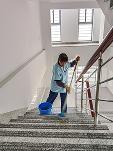 低溫中心項目部的保潔阿姨們在日常維護中,都會定期對扶梯進(jìn)行擦拭。冬季樓梯間寒風(fēng)呼嘯,夏季悶熱難耐。她們無懼寒冷和悶熱,掃、擦、拖,整個樓道在他們勤勞雙手的奮戰(zhàn)中,始終保持整潔明亮,一塵不染的環(huán)境。