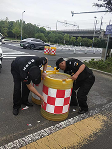 他們首先小心翼翼地將舊貼紙從防撞桶上撕下,確保不損壞防撞桶表面。隨后,使用清潔劑清除殘留的膠痕與污漬,保持防撞桶表面干凈整潔。最后,將新貼紙平整地粘貼在防撞桶上,并輕輕按壓以確保貼紙與防撞桶緊密貼合。