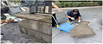 近日,投資廣場(chǎng)項(xiàng)目部在巡邏時(shí)發(fā)現(xiàn)圍墻外圍一塊墻體磚脫落,廣場(chǎng)上的地磚由于車輛的碾壓翹起,這樣既有礙美觀又存在安全隱患。為了確保業(yè)主能順暢安全出行,工程部師傅帶著鐵鍬和榔頭,等車流高峰期過后才開始維修,戴師傅從倉(cāng)庫(kù)拿來之前裝修剩下的水泥材料,擼起袖子就開始修補(bǔ)和平整工作。他先撿起掉落的磚塊放回原位找平,再用水泥澆灌鋪平,在戴師傅精湛的手藝下,墻體被恢復(fù)如初。戴師傅說這是項(xiàng)長(zhǎng)期工作,以后的每個(gè)夏天都需要每天撒一次水,要不然容易開裂。