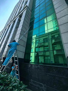 今日,主管安排機動師傅們去門診外樓清洗幕墻玻璃。機動師傅們扛著梯子,拿上保潔工具。在小紅桶里兌上玻璃水和清潔劑,用毛套沾上清潔水對玻璃進行擦拭,再用玻璃刮刀將玻璃上的水刮干凈。在高處的玻璃師傅踩上梯子,一個幫忙扶著,一個將玻璃擦拭干凈。對于高處的玻璃,為了保險起見,項目部決定暫時不予處理。在工作的過程中,項目主管也不斷的提醒師傅們高空作業首先要確保自身的安全。