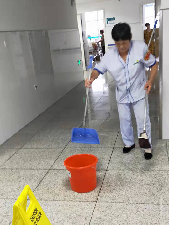 “好醫管”啟東市人民醫院項目部,在巡查病房的時候,內科11層的護士長打來電話說她們樓層上的開水機進水管子突然爆裂,水淌得到處都是,于是我馬上打電話給洗地的師傅,讓他停下手中的活去康復科處理積水,同時又派其他的工友去支援。當我趕到現場的時候,阿姨已經開始在處理積水了,只見一個阿姨先把防滑標志放好,然后用掃帚把積水掃進簸箕里,再倒入桶里,等到大半桶的時候就拎走倒掉,還有一個阿姨用刮刀把遠處的積水都趕到一起,然后用吸水機把積水全部吸干凈。等把走廊里的積水清理得差不多了,師傅又去處理配餐間里的積水,由于配餐間里有硬件設施,所以角角落落的地方阿姨就只能先用拖把拖,接著再用毛巾擦,終于把所有的積水清理得差不多了,該樓層的保潔阿姨馬上處理了現場,看著清清爽爽的走廊,護士長對著工友說了句"有你們真好,謝謝你們!"工友說,那是我們應該做的!