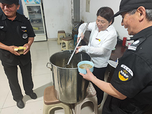 保潔主管施玉莉將一碗碗綠豆湯送到保安、保潔人員手中。在場站的休息室內,保安們身著制服,雖然汗水濕透了衣衫,但喝著清涼的綠豆湯,臉上露出了欣慰的笑容;保潔阿姨們放下手中的清潔工具,接過綠豆湯,對管理部的貼心之舉連連稱贊。