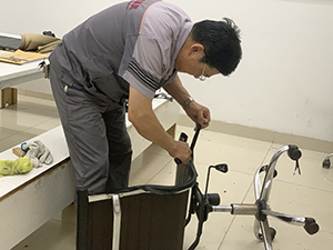 方案確定后,工程部立即啟動采購流程。待皮革材料到位,許躍東、張德浩等經(jīng)驗豐富的師傅便迅速投入到維修工作中。他們嚴(yán)格按照維修流程,先根據(jù)每把椅子的長寬尺寸,將一卷卷皮革精準(zhǔn)裁剪成合適的片狀;隨后小心拆卸椅子的損壞部件;接著將裁剪好的新皮革仔細(xì)覆蓋在破損處并進(jìn)行粘貼固定;之后再對細(xì)節(jié)部位進(jìn)行精細(xì)裁剪,確保貼合度;最后用力壓緊所有縫隙,讓新皮革與椅子完美融合。