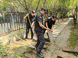 整個換管過程中,保安團隊始終堅守現(xiàn)場,協(xié)助維護秩序、清理施工廢料,雙方默契配合。經過近 3 小時的緊張搶修,新管道安裝調試完成,對塌陷區(qū)域進行泥土回填、平整地面,并清理干凈現(xiàn)場雜物。