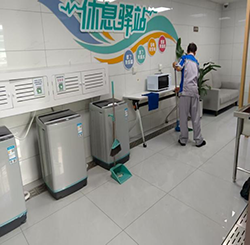 在衛(wèi)生間最里端,專為司乘人員設(shè)置了淋浴房,讓長(zhǎng)途司乘人員沖掉疲憊。洗衣房?jī)?nèi),司機(jī)師傅彎腰投放換洗的衣物,洗衣機(jī)靜靜運(yùn)轉(zhuǎn),司機(jī)坐在沙發(fā)上閉目養(yǎng)神,旅途積攢的疲憊,隨衣物洗凈漸漸消散。這里不僅解決洗衣難題,更傳遞著“家”的關(guān)懷——無(wú)需再把臟衣囤到終點(diǎn),隨時(shí)能換一身清爽出發(fā),然而留下的垃圾及衛(wèi)生就留給“高正人”,他們默默地仔細(xì)打掃著每個(gè)角落,只為司乘人員提供更舒適的環(huán)境。