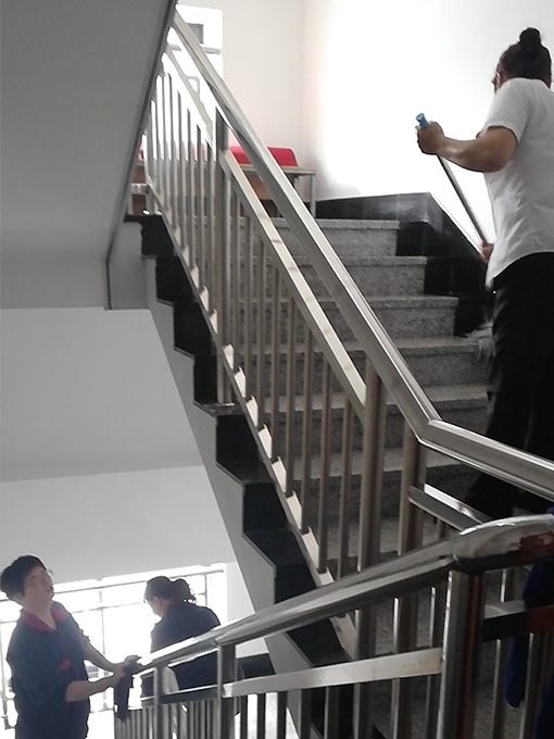 常州特檢院大樓投入使用已有十幾年,大樓樓梯間墻面受潮破損嚴重,影響美觀。特檢院項目部與甲方領導協商決定利用國慶假期人員放假的情況下對樓梯間墻面進行全面修復。假期第二天,施工人員進院操作,物業安排人員協助其工作,先對墻面破損地方鏟除并用膩子修補,再用乳膠漆對墻面進行全面噴漆,在大家辛苦的努力下,終于完成了墻面修補。前期工作的完工,預示著物業后期打掃也要進入一個新的征程。一到七樓,整個地面鏟下來的墻皮和灰塵以及墻面脫落的油漆,讓人無從下腳。但是我們的保潔人員不怕臟不怕累,分工明確,有條不紊加班加點的在甲方上班前完成了整個大樓的清理以及細節衛生打掃。雖然大家都汗流浹背,灰頭土臉,但是看著嶄新的墻面地面,項目部所有的員工都露出了欣慰的笑容。