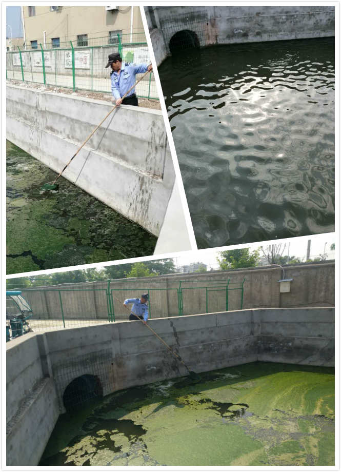 原來的污水溝水源質量不行,含有的藻類受到陽光照射,產生光合作用,催生了微生菌,所以水中的綠色漂浮水藻、青苔類較多,等氣溫升高,非常容易引起水質發黑、發臭。我們安排安保人員用長柄型的濾網斗進行清掏打撈,并及時將打撈上來的垃圾清理運走;同時對安保人員進行安全培訓,在打撈期間注意自身的安全,防止跌落等意外發生,排除安全隱患。
